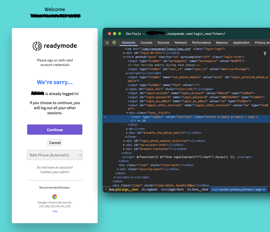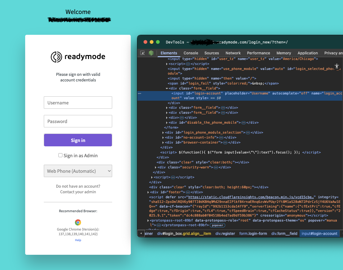 ReadyMode enforces single-session admin access, which meant we couldn't just scrape with basic tools. We used SeleniumBase's CDP mode to drive a real Chromium session, capture authenticated cookies, and hand them off to faster HTTP calls.