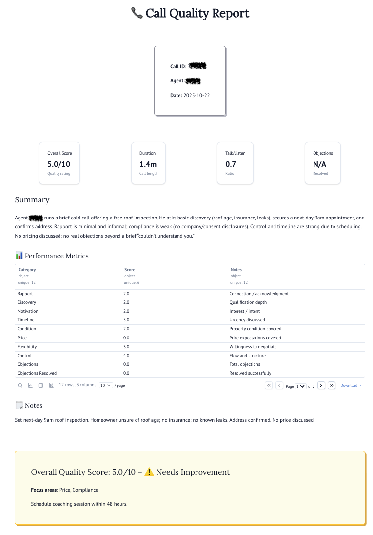 A lead-generation agency serving real estate investors came to us with a simple but costly problem. Their human QA process was killing their velocity. Every qualified call required manual review before client delivery, creating a 2-hour bottleneck that only got worse as they scaled.